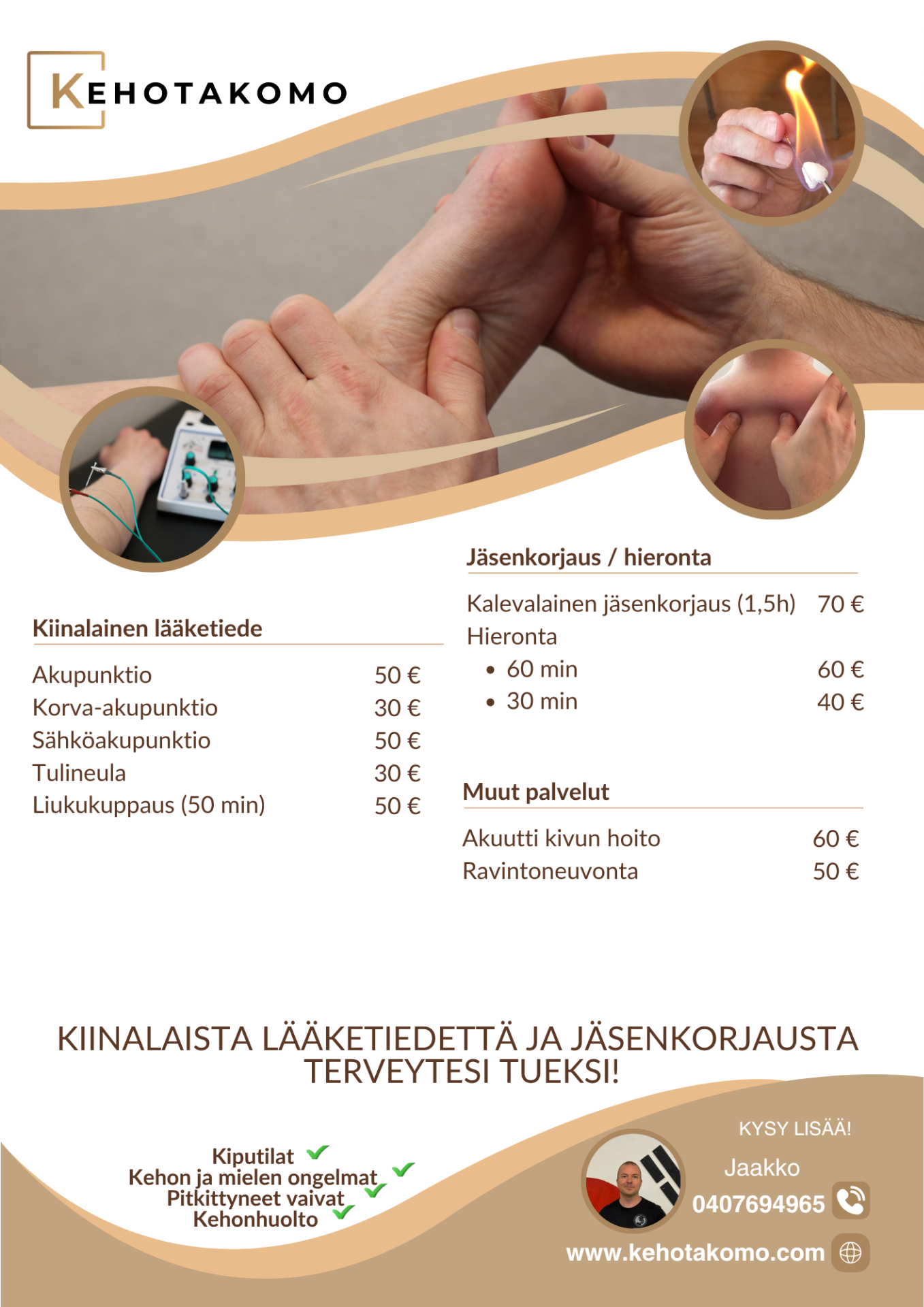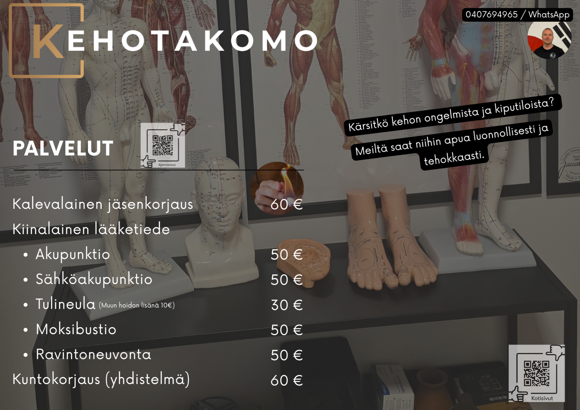 * Palvelut ovat pääosin kehon kiputilojen ja ongelmien hoitoon sekä kehonhuoltoon ja sisältävät aina tarpeen mukaan liikunnan-/kehonhuollon (itsehoito) ohjauksen.